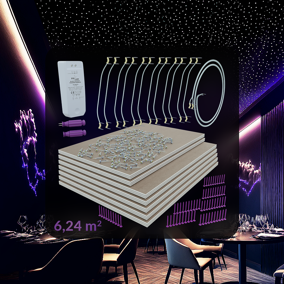 Gotowe zestawy produktów do zastosowań w lokalach użytkowych, składające się z diód LED, płyt z odpornością ogniową, zasilacza, przewodów i łączników wyposażone w narzędzia do dziurkowania płyty oraz aplikacji diód LED. Przeznaczone do oświetlania sufitów i ścian w biurach, restauracjach, hotelach, sklepach, gabinetach SPA, basenach, salonach piękności itp.